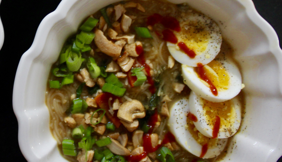 8. Ladle noodles into bowls and top with cashews, sliced eggs and the greens of the scallions. Add Sriracha if using. Serve immediately.