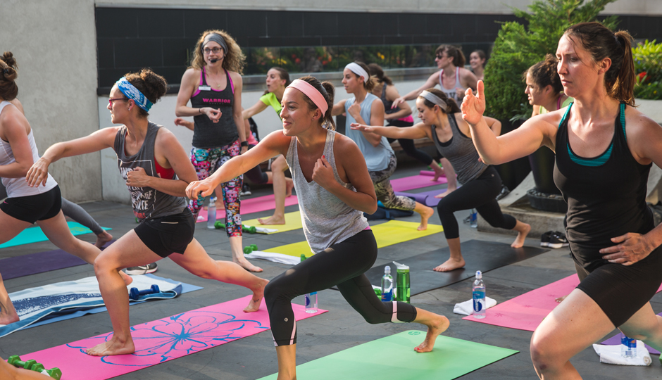 That’s a yoga class that works in weights and moves like squats and lunges for a serious sweat session.