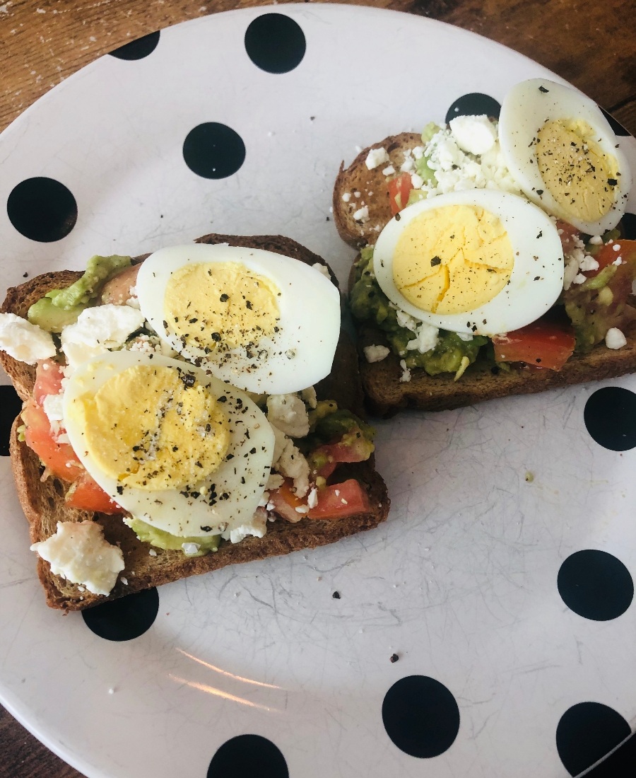 11:30 a.m. — I eat an early lunch because I’m hungry (who says lunch has to be at noon, anyway?). I make avocado toast with feta and a hard-boiled egg on bread. Yum.
