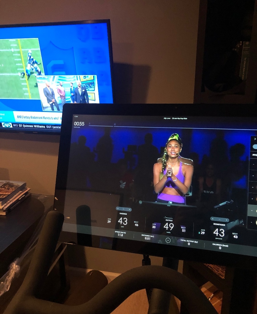 Despite a long Monday, Anderson completes a Peloton spinning class (and preps for Monday Night Football). / Photograph by Brian Anderson