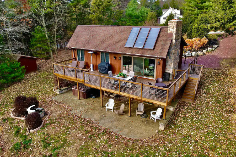 With views of the upper Delaware River, this waterfront cabin has three beds, a wood-burning fireplace, an outdoor hot tub, and direct access to the river. Though on the Pennsylvania side, it’s only five minutes to the quaint Catskills town of Narrowsburg by car. Average of $242 per night.