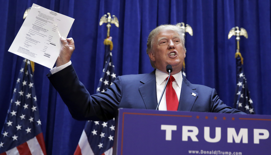 Developer Donald Trump displays a copy of his net worth during his announcement that he will seek the Republican nomination for president, Tuesday, June 16, 2015, in the lobby of Trump Tower in New York. (AP Photo/Richard Drew)