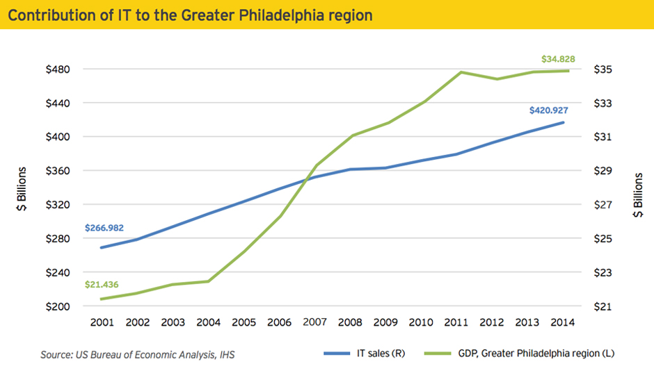 IT companies in the Philly region generated annual total sales revenue of nearly $34.8 billion, up from $21.4 billion in 2001, according to the study. IT now represents approximately 8.3 percent of the region’s gross domestic product.
