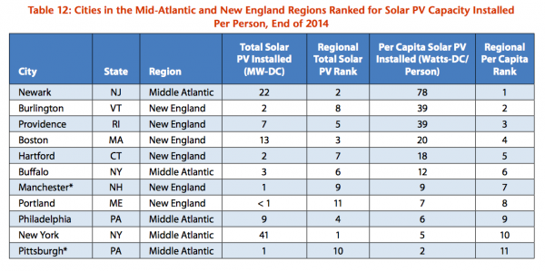 The annual “Shining Cities” report by Environment America is out and Philadelphia solar power capacity remained unchanged from the year before. At the end of 2014, the city had 9 megawatts of solar capacity — exactly the same amount in the prior year’s report — and we ranked 41st out of 65 cities in per-capita power, sliding back from 35th in 2013. That comparative regression can be witnessed by the leaps made in the nearby city of Newark — which installed 9 megawatts in 2014 alone, the equivalent of our entire grid’s capacity.