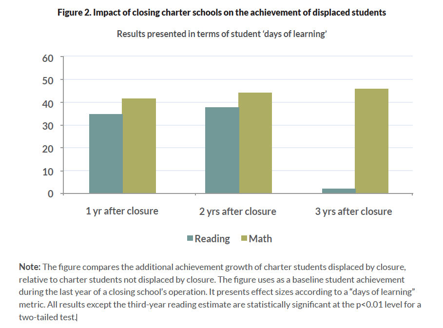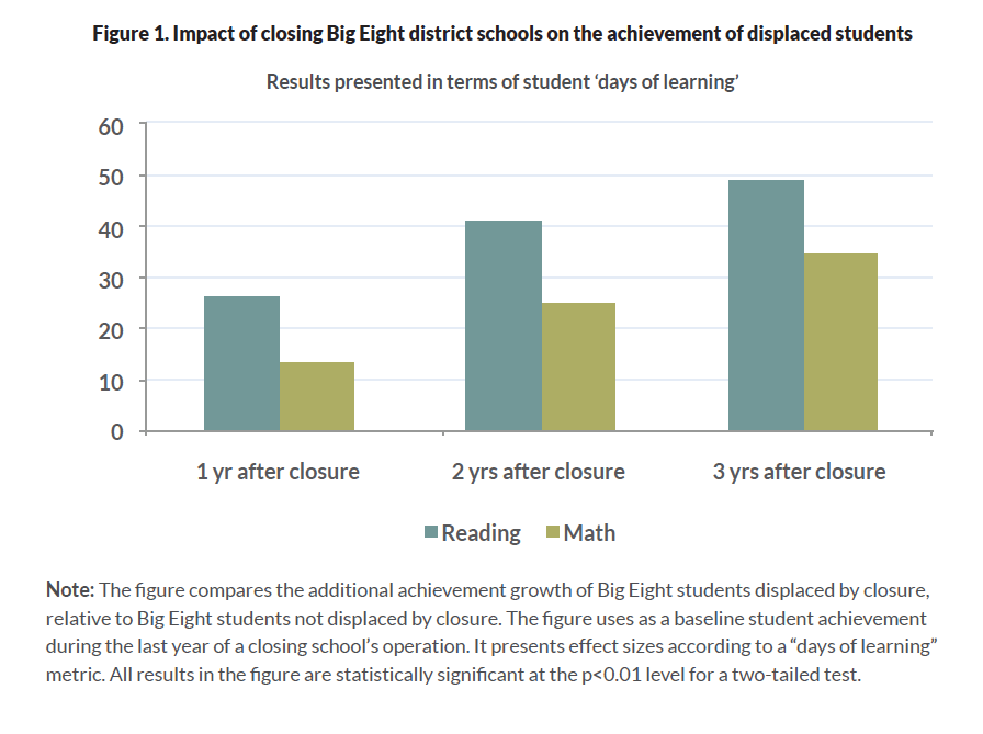 The authors’ findings are summarized in this chart. The gains in math and reading scores are measured in “days of learning,” a metric the study defines as “indicating the number of additional days of learning a displaced student would have needed in order to achieve at the same level if she were still attending her closed school.”