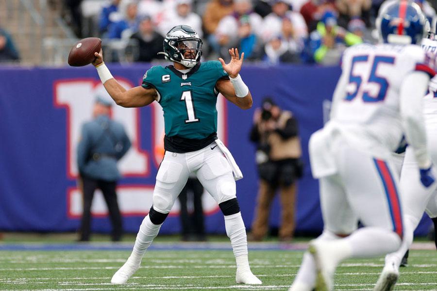 Jalen Hurts passes the ball in the first quarter against the New York Giants at MetLife Stadium on November 28, 2021. / Photograph by Sarah Stier / Staff via Getty Images