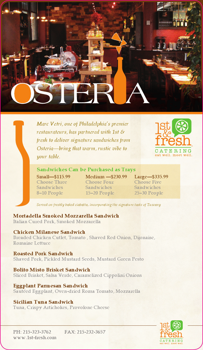 1st & Fresh Catering is partnering with Marc Vetri to offer sandwiches from Osteria. Get Vetri’s take on roasted pork, sliced brisket and eggplant Parmesan delivered to your next event. [1st & Fresh Catering]