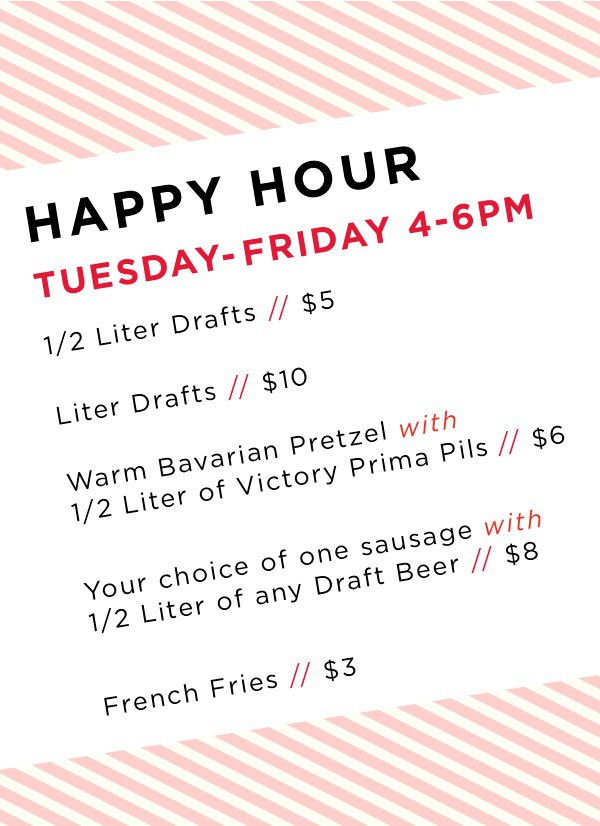 Starting today Frankford Hall is offering happy hour from 4 to 6 p.m. All draft beers are discounted and a warm pretzel and half-liter of Victory Prima Pils is $6, a sausage and any half-liter of beer is $8.