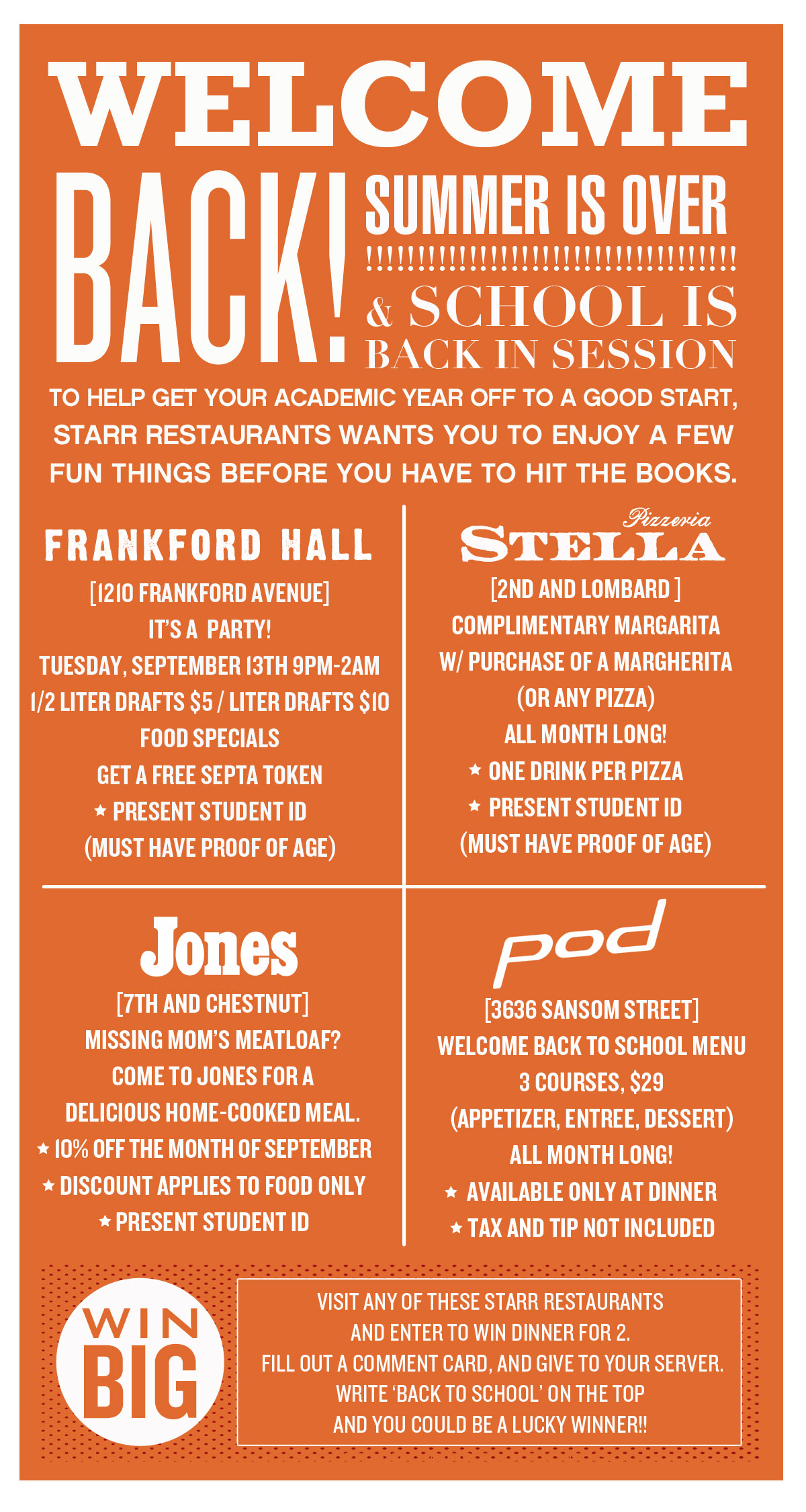 This month Starr Restaurants Group is offering several back to school deals for college students. Tonight from 9 p.m. to 2 a.m at Frankford Hall it is $5 half-liters of beer and food specials. You also get a free SEPTA token when you present your student ID.