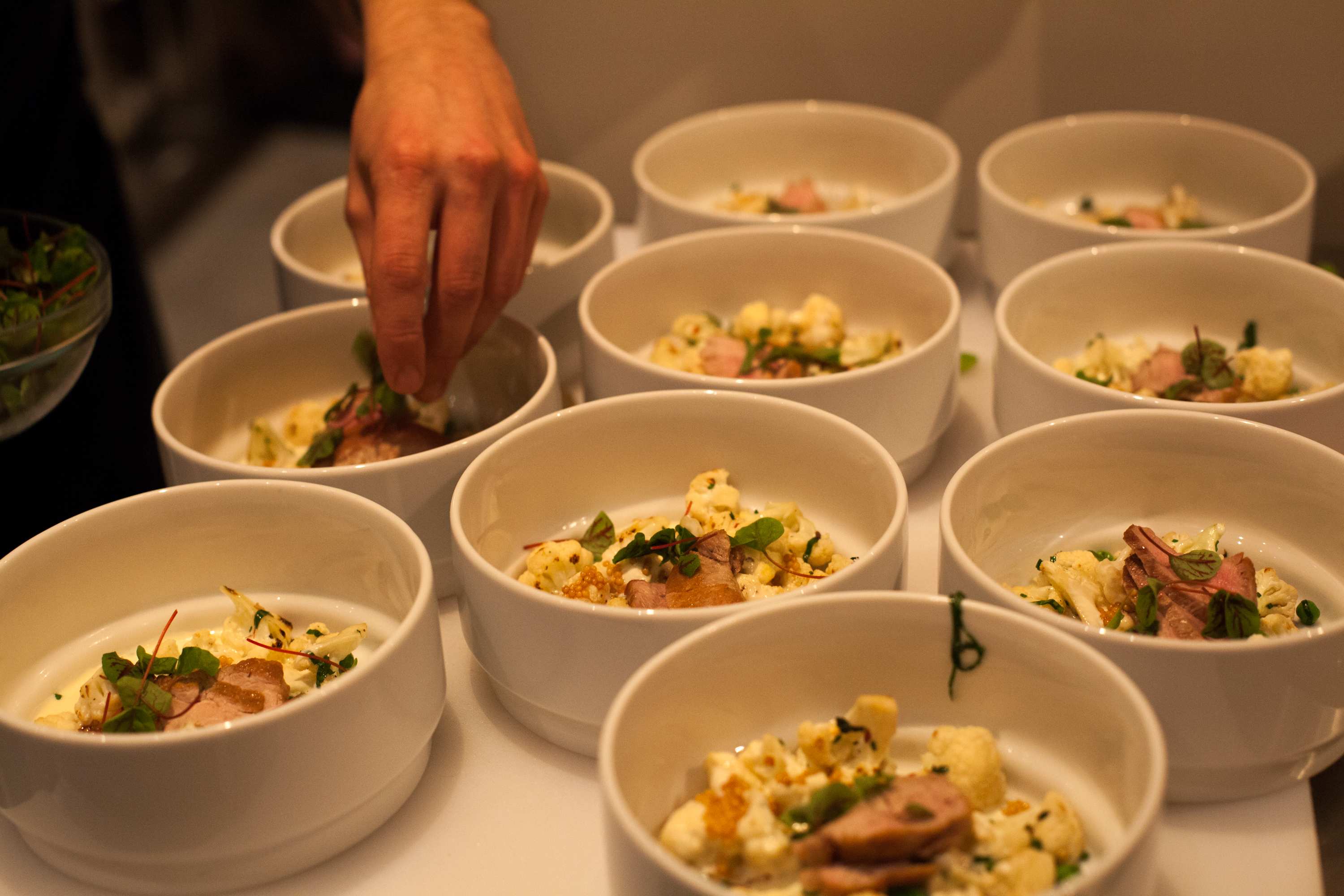 And this is what a trained chef can do, even when presented with crap ingredients: George Sabatino’s roasted cauliflower with pork tenderloin and pickled mustard seeds in Kraft American Singles sauce, which was fantastic.