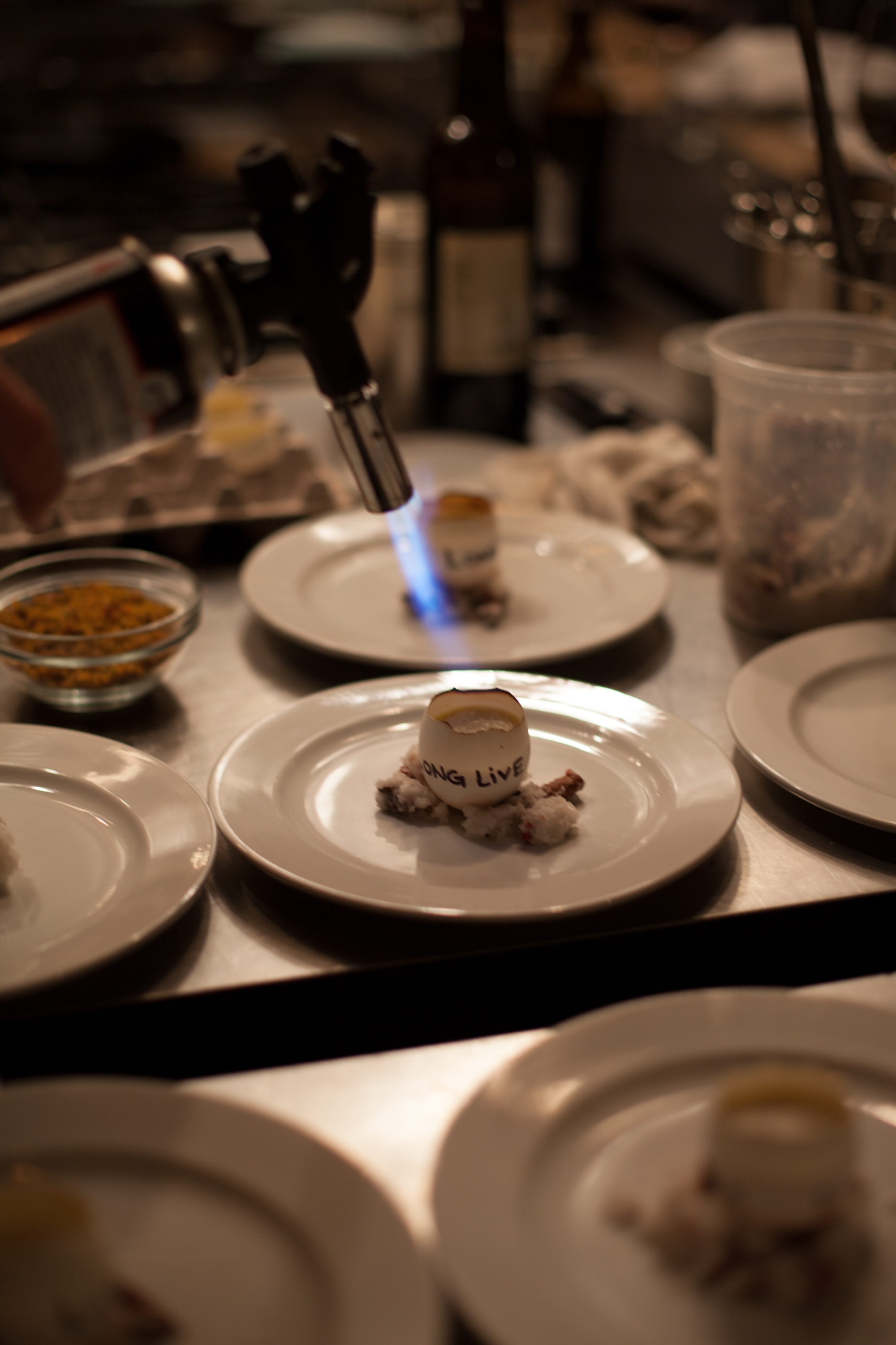 On a final note, one of the things that kept those scores so close? The absolutely unbelievable dessert put up by Ben Puchowitz–a guy who, by his own admission, had never made a dessert before last night. He did a foie gras creme brulee, torched in an eggshell, topped with a coffee whipped cream, a bit of praline and shaved, frozen foie gras and chocolate torchon. It was a singularly amazing dish–one of the best things I’ve eaten in six months–and each portion came with a political message courtesy of the chef. In case you can’t make it out in the picture, his sous had written “LONG LIVE FOIE GRAS” on every shell, in response to the recent California ban.