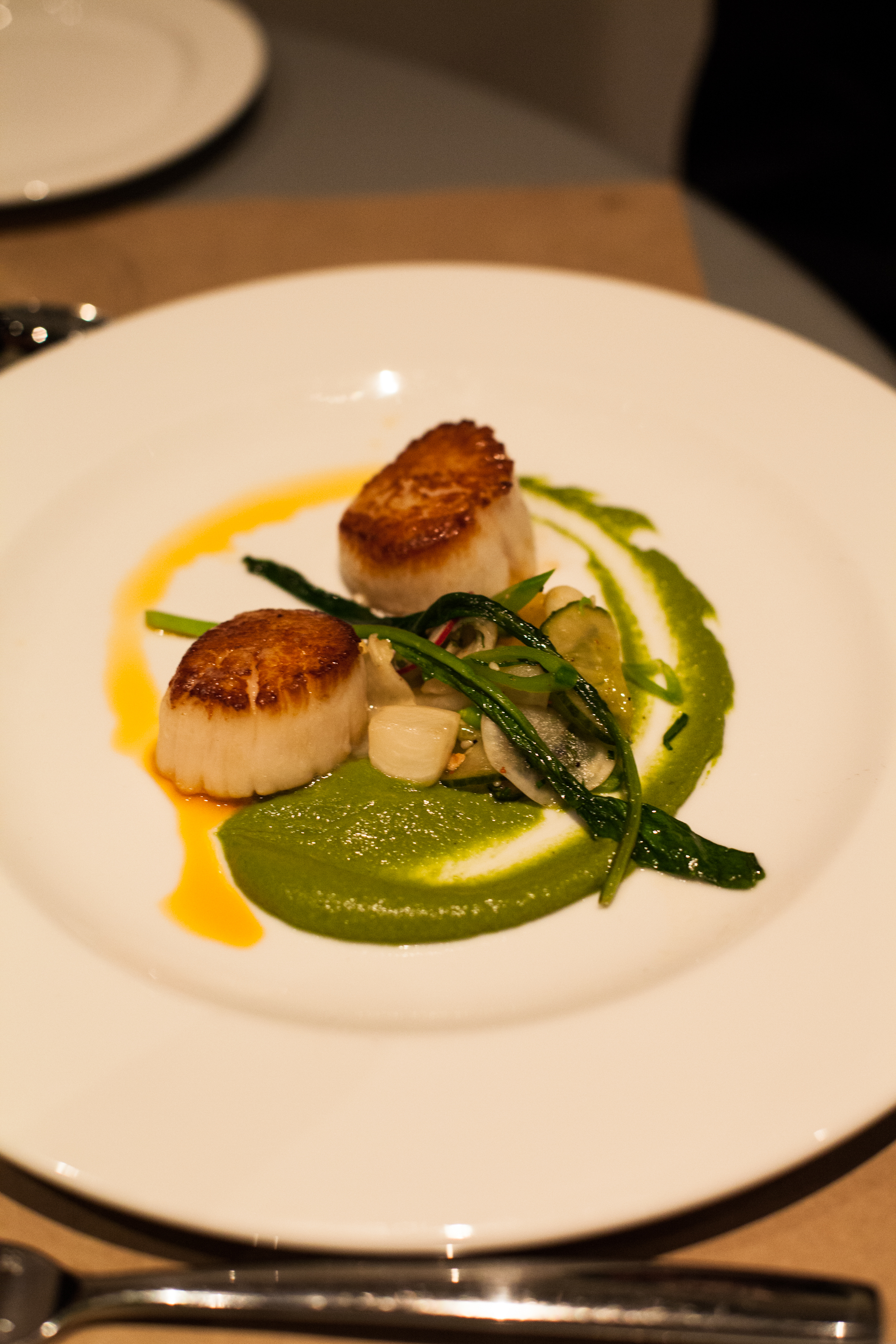 Still, this is the plate that George was able to assemble: Seared scallops with chili oil over a salad of fast-pickled radishes.