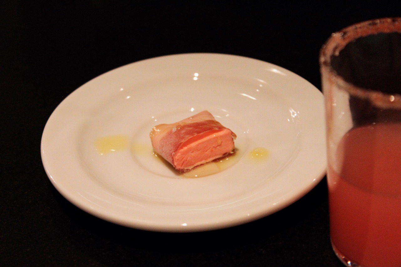 Guests arrived and the cooks started off strong, plating two amuse bouches that immediately illustrated the differences between their styles. Betz (assisted by Sean Korcal of Bardot Cafe), displayed refined sensibilities, offering a first bite as well as a first sip: a few ounces of bright pink blood orange margarita in a glass rimmed with chili sugar, accompanied by a bonbon of blood orange semifreddo wrapped in smoky speck.