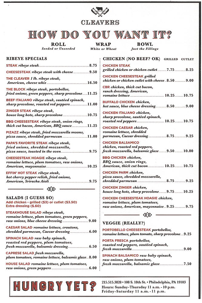 Spike Mendelsohn’s hamburger joint, Good Stuff Eatery has made way for Cleavers, an ambitious cheesesteak spot that hopes to make a go of it at 108 South 18th Street. The steak shop opened last night and features a “How Do You Want It?” menu of steaks, chicken sandwiches, salads and perhaps reluctantly veggie sandwich options. There are also a selection of fries, sides, beer and boozy shakes.