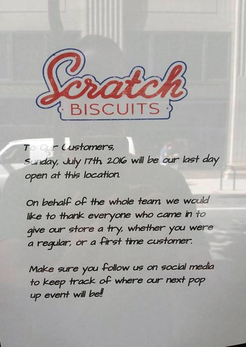 Scratch Biscuits, the quick-serve biscuit sandwiches spot at 1306 Chestnut Street by chef Mitch Prensky, closed after a year in business. Prensky posted a photo of the closure notice, hanging in the window of Scratch Biscuits, on Facebook today. Prensky thanked all his customers who gave the store a try.