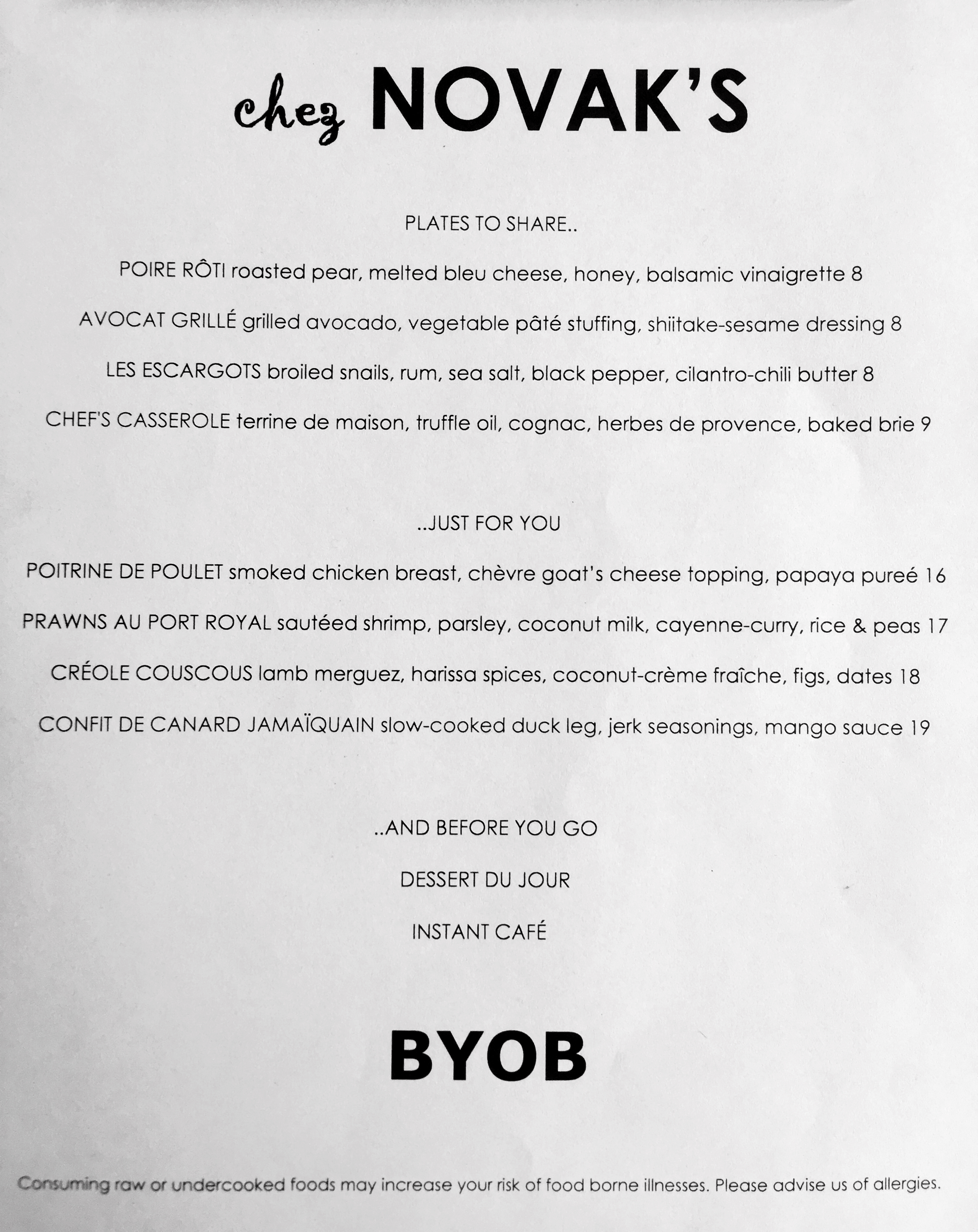 After soft-opening festivities last weekend, Novak’s begins serving classic French cuisine (with the occaisonal Caribbean or North African inflection) tonight at 6 p.m. They’ll be open Wednesday through Saturday evenings for now — late on Friday and Saturday — with plans to roll out weekend brunch this fall.