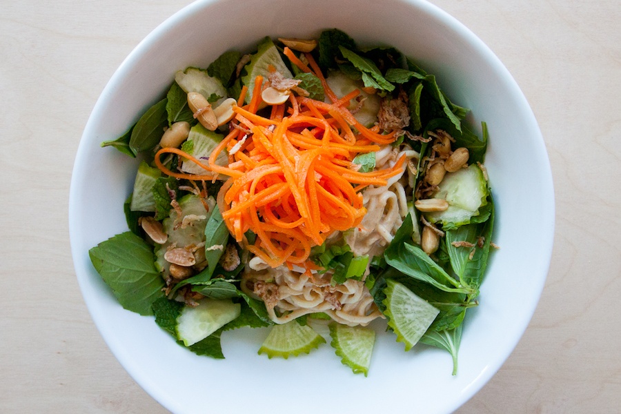 “Since we started serving cold noodles at Stock people have always asked, ‘How do you make it so creamy?’ ‘Do you add cream?’ I’m here to share the secret. By adding enough liquid to peanut butter or tahini you can make your own peanut sauce or sesame sauce and skip spaghetti with tomato sauce for a meal or two. This is a modified version to work with what you might have in your pantry right now.”