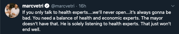Marc Vetri took to Twitter last night to voice his disappointment in the decision to keep dining rooms closed, which garnered some criticism online, particularly over this (now-deleted) tweet: