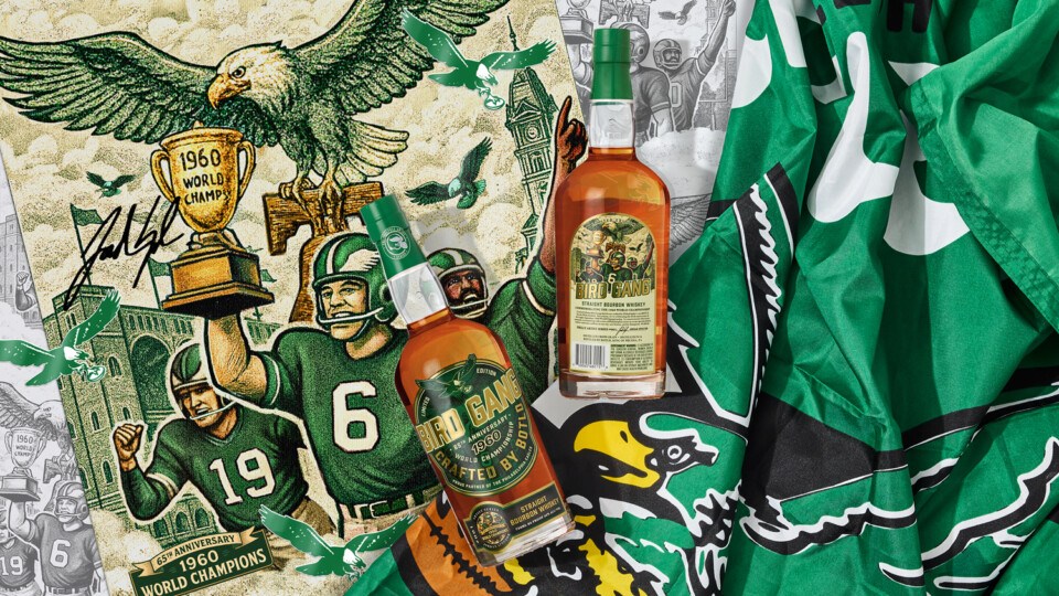 Spector’s bourbon bottle design channels classic, vintage Americana — a nod to both the Eagles’ history and the timeless appeal of bourbon. The gold-and-green label shows players hoisting their trophy with Franklin Field — the Eagles would have played at UPenn’s stadium during their 1960 championship season — in the background.