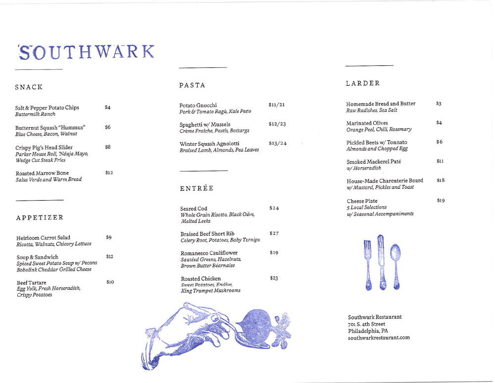 Chris D’Ambro and Marina De Oliveira quietly reopened Southwark over the weekend but today they shout it out to the mountains that the Queen Village restaurant is open for business.