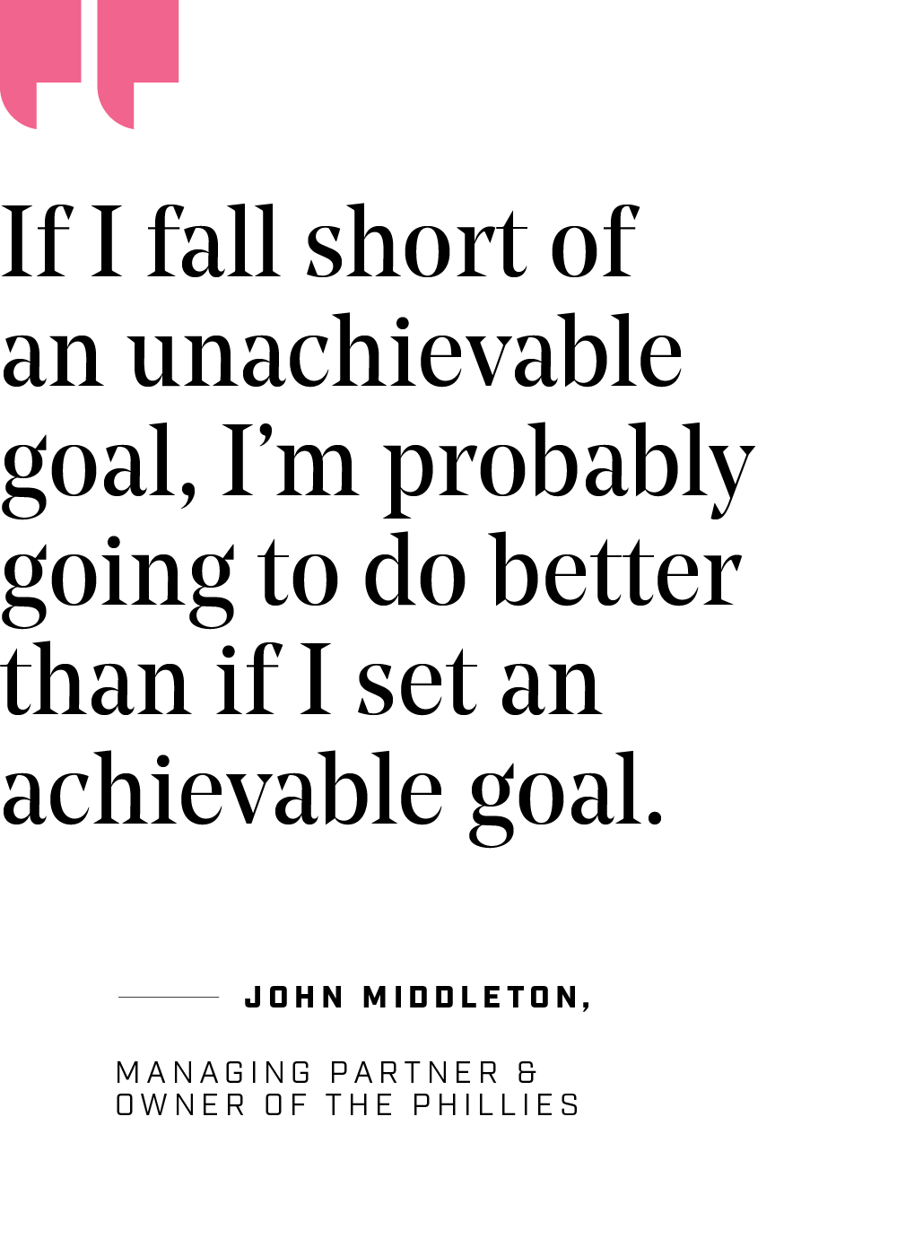 It’s a tall order, though the Phillies have assembled a roster full of stars in their prime and a farm system laden with high-upside prospects. History suggests that perpetual competitiveness is rare, maybe even impossible, but that doesn’t faze Middleton. “My father once told me, ‘Your goals are unachievable.’ I said, ‘Yeah, but if I fall short of an unachievable goal, I’m probably going to do better than if I set an achievable goal.’” It’s the kind of mindset that can permeate an organization and, as the last few years have shown, a whole city.
