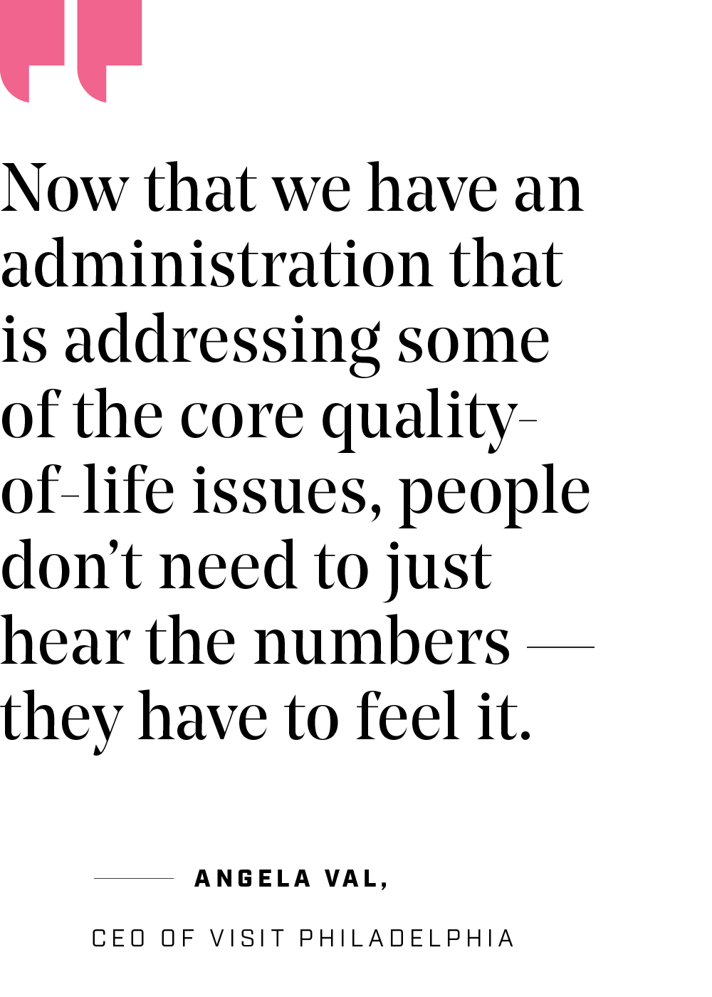 “Now that we have an administration that is addressing some of the core quality-of-life issues, people don’t need to just hear the numbers,” Val says. “They have to feel it, have to feel the place is getting better and that this is a place they want to be.” If not the Schuylkill Expressway, then at least Philadelphia.