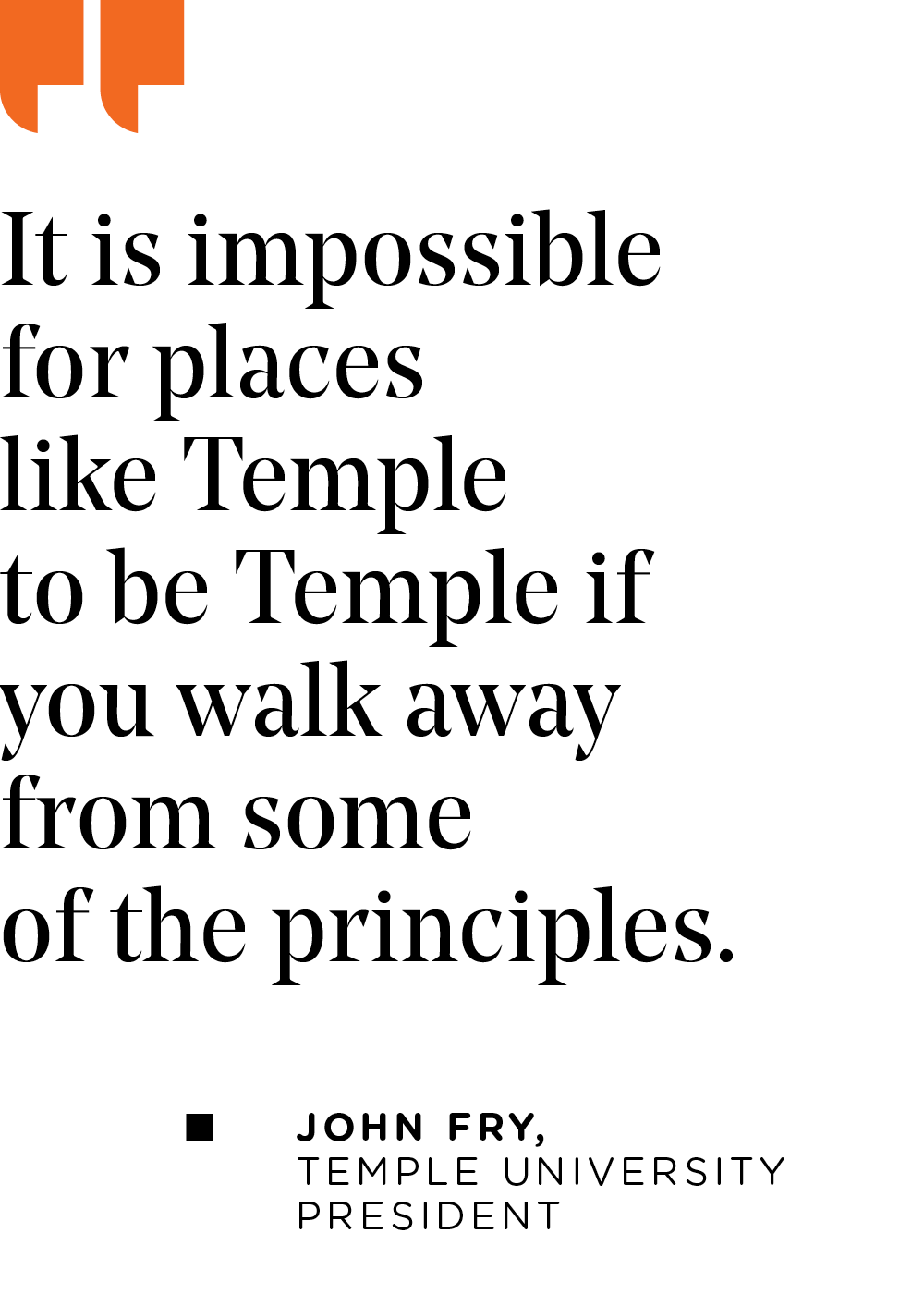Say the Word: Fry landed at Temple, a university that exists to educate a diverse population, just in time for diversity to become verbum non gratum in Trumpworld 2.0. Still, in his April investiture address, the new prez did not shy away from celebrating diversity and inclusion. No Big Deal: “I didn’t try to deliver any kind of political talk,” Fry tells us. “The point is that it is impossible for places like Temple to be Temple if you walk away from some of the principles.” Still, in an era when most university presidents live in fear of a U.S. House summons, Fry showed guts. Opportunity: Temple’s acquisition of Terra Hall, the largest piece of the former University of the Arts campus, means that TU’s Center City outpost will eventually move to the Avenue of the Arts — a potential game changer, notes developer Allan Domb (#41), for the sometimes stodgy thoroughfare.
