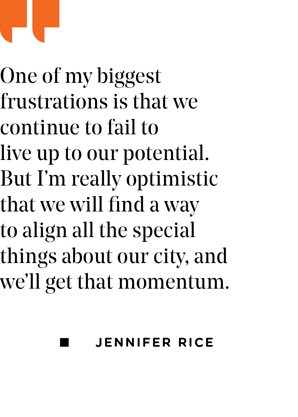 That’s a lot of activity in a lot of different spaces for one couple, but they say it’s all of a piece. “Michael and I love our city so much,” Rice says. “One of my biggest frustrations is that we continue to fail to live up to our potential. But I’m really optimistic that we will find a way to align all the special things about our city, and we’ll get that momentum.” — T.M.
