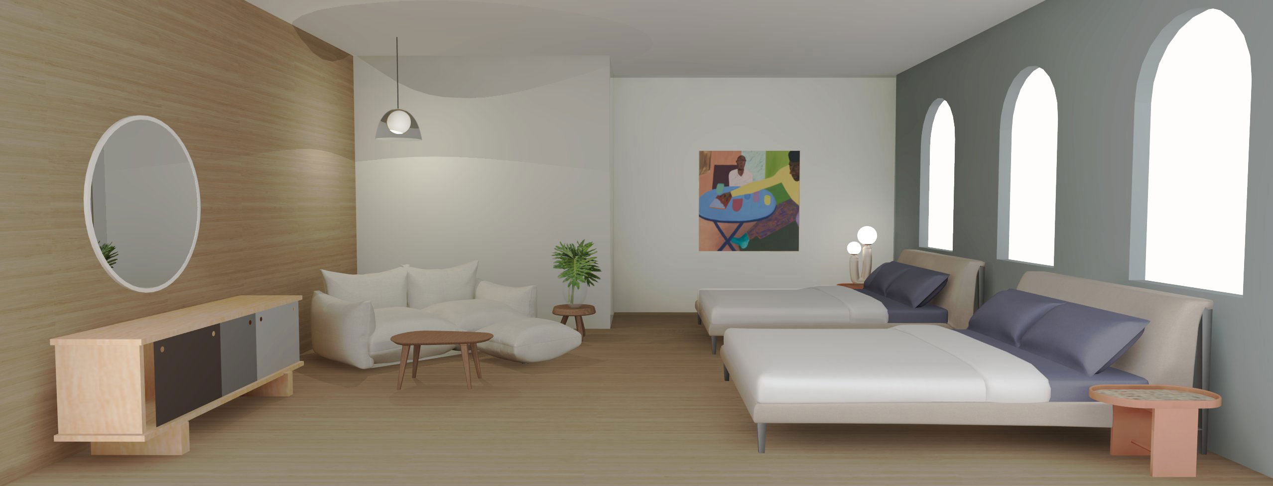 A double bedroom in the boutique hotel. Rendering by Christine Espinal