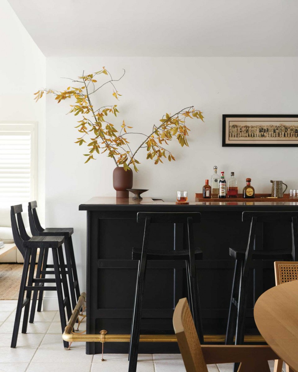 It was originally splashed in old-school glass tile, but the designer laid drywall over the back and finished the piece in an ebonized black stain. The clients had a vintage black-and-white photograph depicting women at the beach that Hakimfar hung behind the bar.