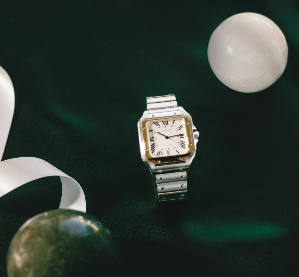 Luxe Philly gift guide picks include this large-model Santos de Cartier watch with automatic movement and interchangeable metal and leather bracelets, $7,450 at Bernie Robbins Jewelers, Somers Point and Villanova / Photography by Jillian Guyette / Styling by Emilie Fosnocht