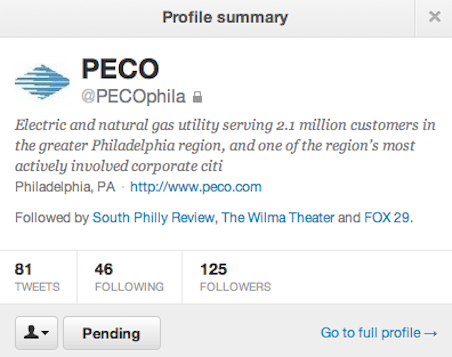 With the ominous Hurricane Sandy set to make landfall in the Philadelphia area, Twitter users might be looking to the Twitter account of PECO (aka Philadelphia’s electric company) for updates about service and advice for weathering the storm. Well, PECO may have an “army of thousands” ready to battle damage from Sandy, but what they don’t have is a serviceable (or even readable) Twitter account. Protected tweets? Following 46? Only 125 followers? And why is my electric bill so high? Even the Philadelphia Water Department is on Twitter during Hurricane Sandy.