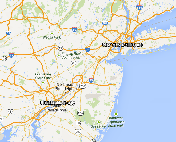 The Atlantic Cities flags a website that collects Yahoo! autocomplete searches for various cities, states, and countries, and then flings them onto a map. Philly, per usual, got the short end of the stick.