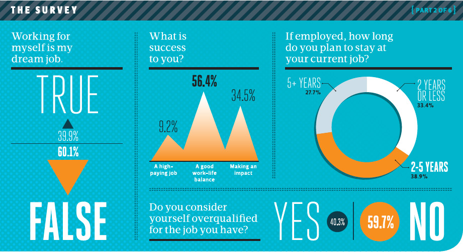 Hillman today runs Indy Hall, the co-working spot in Old City. It has about 250 members, the majority of them freelancers. Generationally, his story isn’t unique. One recent study from the Young Invincibles nonprofit found that 54 percent of 872 millennials either want to start a business or already have. Millennial Branding, a Gen-Y research and consulting firm, conducted a survey of more than 3,000 freelancers—two-thirds were millennials—earlier this year and found that 72 percent of respondents holding “regular” jobs in addition to their freelance gigs want to quit; about two-thirds expect to do just that within two years. Of those willing to quit, 69 percent say “freedom” would be their main reason for leaving their current jobs. Philly Mag’s recent survey of local millennials found that four out of 10 of us consider working for ourselves a dream job—not a majority, but still a sizeable portion.