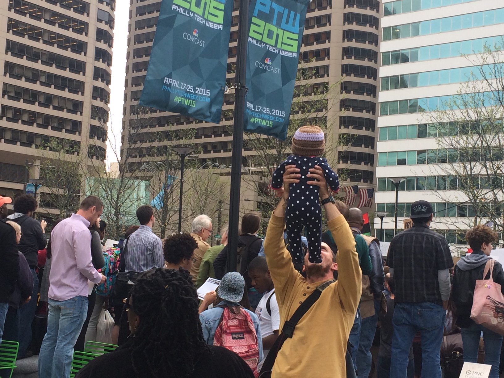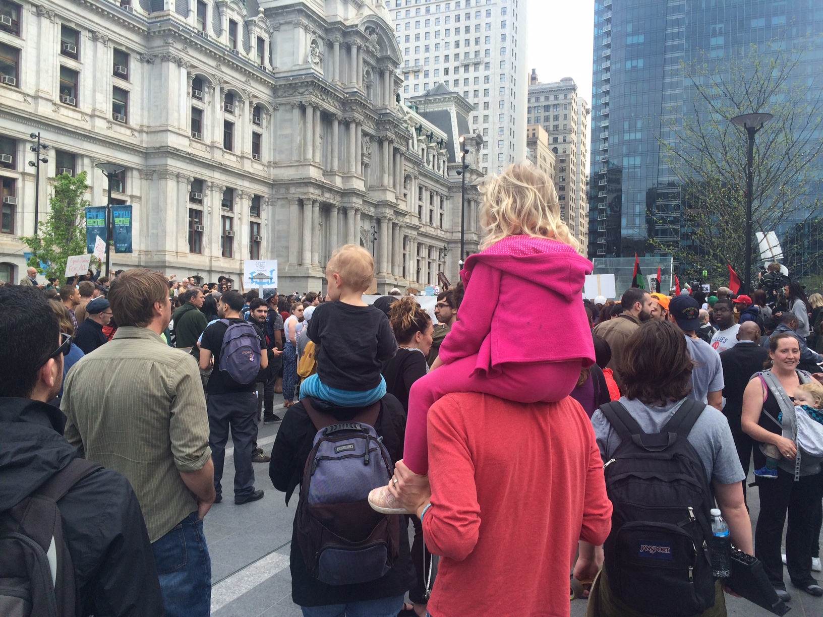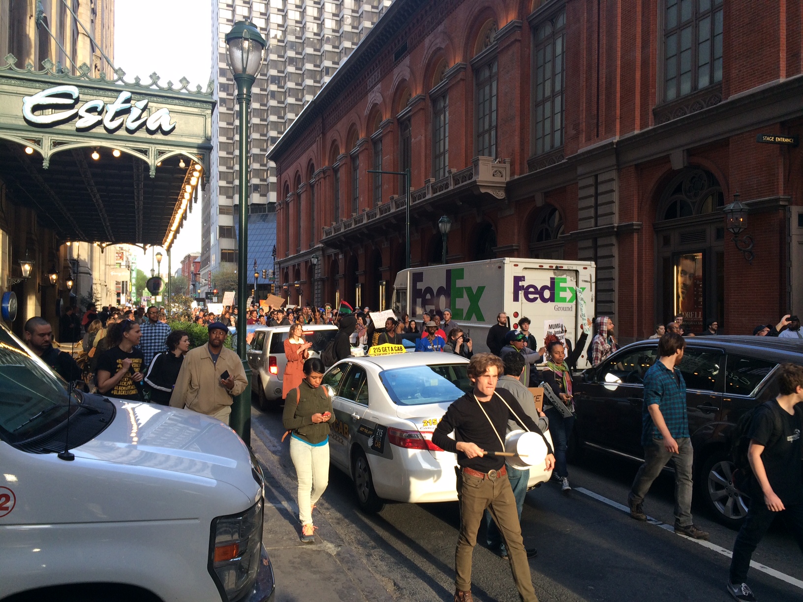 It was a tense night in Center City, Philadelphia, for the “Philly Is Baltimore” protest, which centered around both the death of Freddie Gray, who died earlier this month in the custody of Baltimore police, and the death of Brandon Tate-Brown, who was shot and killed in a December altercation with Philadelphia police. I arrived at City Hall around 3:30 p.m. and watched the crowd slowly grow in numbers to more than a thousand. Here are some photos, videos and observations from the protest that was, for the most part, tensely peaceful.