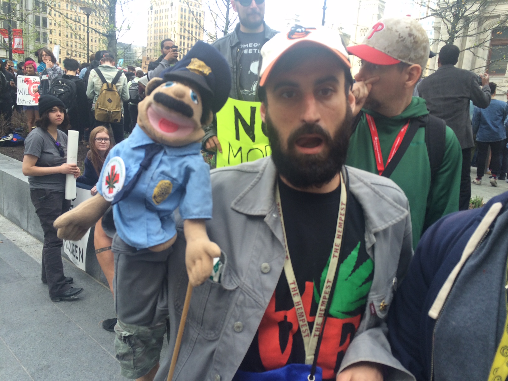 Philadelphia marijuana activist N.A. Poe never turns down an opportunity to smoke pot at an event, and here he is with his cop puppet, just after sucking on a joint: