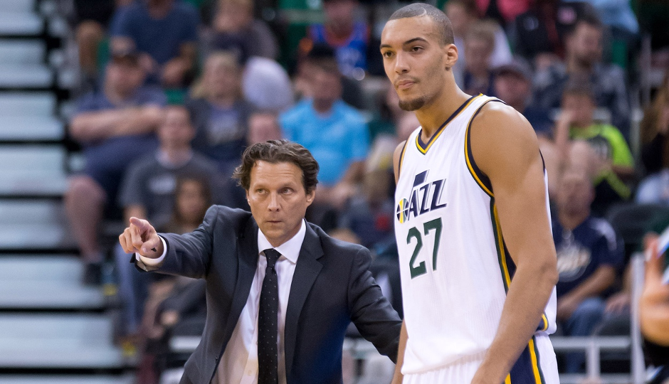 Jazz head coach Quin Snyder talks with Rudy Gobert during a preseason game. Gobert turned the Jazz into a defensive juggernaut | Russ Isabella-USA TODAY Sports