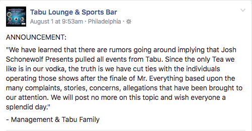 When reached by G Philly for comment about his payment practices and Tabu’s Facebook posts, Schonewolf did not address any specific allegations but did send the following statement admitting that he had been “untimely” with payments to his performers: