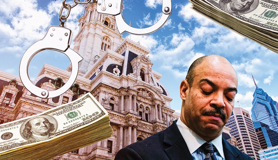 Seth Williams courtesy of Matt Rourke/Associated Press; Cuffs, money, City Hall courtesy of iStock. Illustration by Gluekit