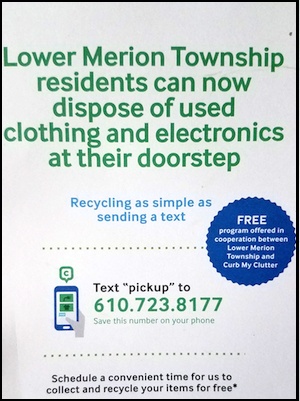 The new program is the result of a partnership between Lower Merion Township and Curb My Clutter, the company that makes it all happen. The idea here is that townships like Lower Merion spend a lot of taxpayer money hauling unwanted clothes and electronics to the landfill, when there’s actually a moneymaking opportunity in reselling those items. Old computers can get refurbished. The clothes that don’t fit you anymore will fit somebody else just fine.