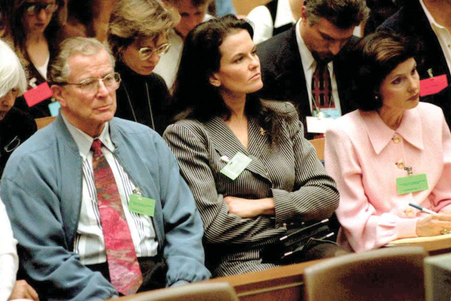 Gloria Allred with Denise Brown, sister of Nicole Brown Simpson, at a hearing for O.J. Simpson in 1995. / Photograph by Vince Bucci via Getty images