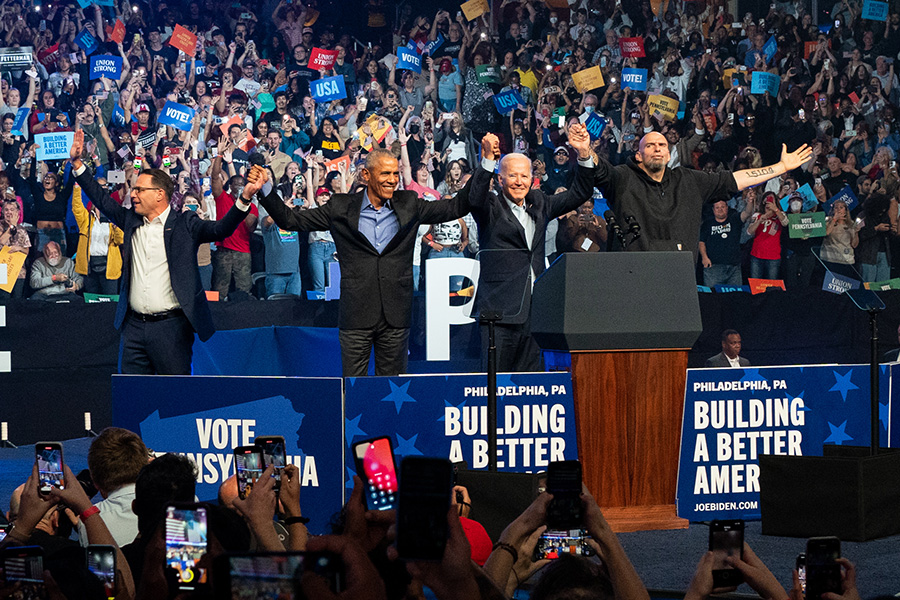 Josh Shapiro, Barack Obama, Joe Biden and John Fetterman in Philly, days before the midterm election brought a “blue wave” to Pennsylvania / Photograph by Caroline Gutman for The Washington Post via Getty Images