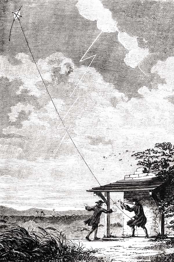 So Ben didn’t “invent” electricity; nature took care of that. And people did know about electricity; they used it for parlor tricks that employed sparks and shocks. What Ben did was observe that there are similarities between electricity and lightning, then prove they’re the same thing by flying that kite in a thunderstorm in 1752 with the help of his (grown) son, William. And the kite wasn’t struck by lightning, as that would have cooked Ben proper. Instead, it picked up an electrical charge from the atmosphere that was conducted through the kite string to an attached metal key. When Ben moved his knuckle near the key he got an electrical shock. The experience helped guide future experiments and inventions like the lightning rod.