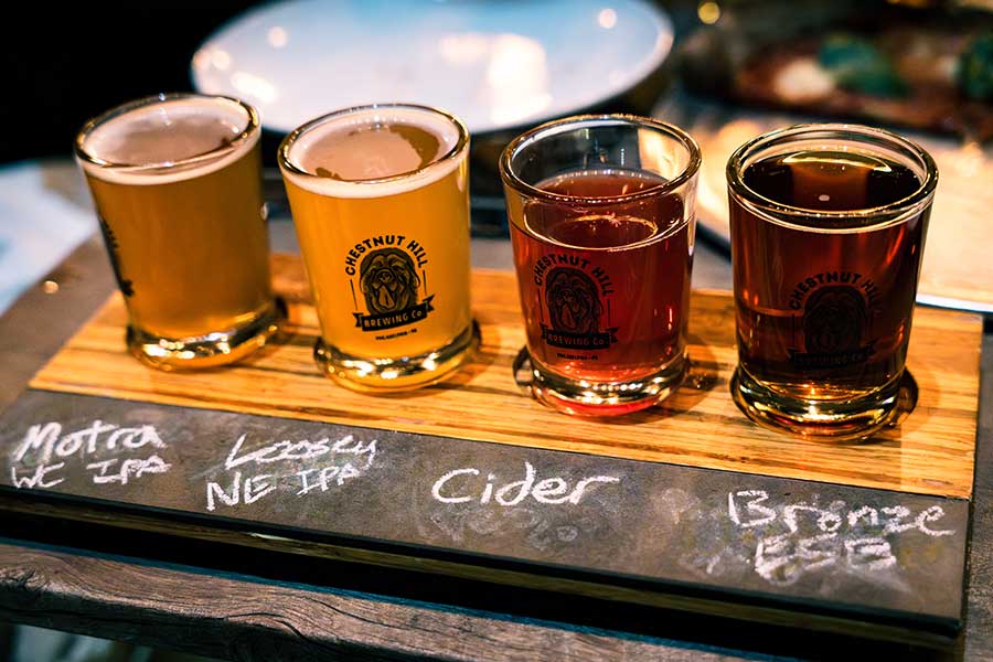 Flights of beer at Chestnut Hill Brewing Company, one of several great bars and pubs in the Northwest Phily neighborhood / Photograph by Philippe LeSaux
