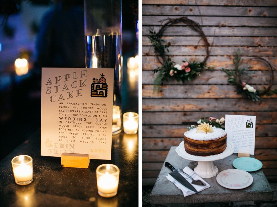 Another touching element was the dessert, which was baked according to a special and sentimental recipe. “The cake was Apple Stack Cake,” says Erin, “It was my great grandmother’s recipe, a traditional wedding cake from the Appalachians. It was a surprise for my mom as she didn’t know I got her recipe card and gave it to the chef to follow.”