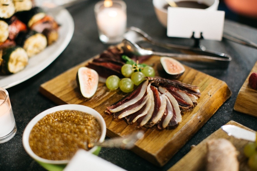 Their 100 guests enjoyed dining on bites in an indoor-outdoor space at Martha at their May wedding. When the couple entered, their first dance was to “If We Were Vampires” by Jason Isbell and the 400 Unit. The favors were a favorite element: whiskey glasses with scene from their invitation of outside Martha and Philadelphia Brewing Company, designed by Nicole from Rabbit Rabbit.