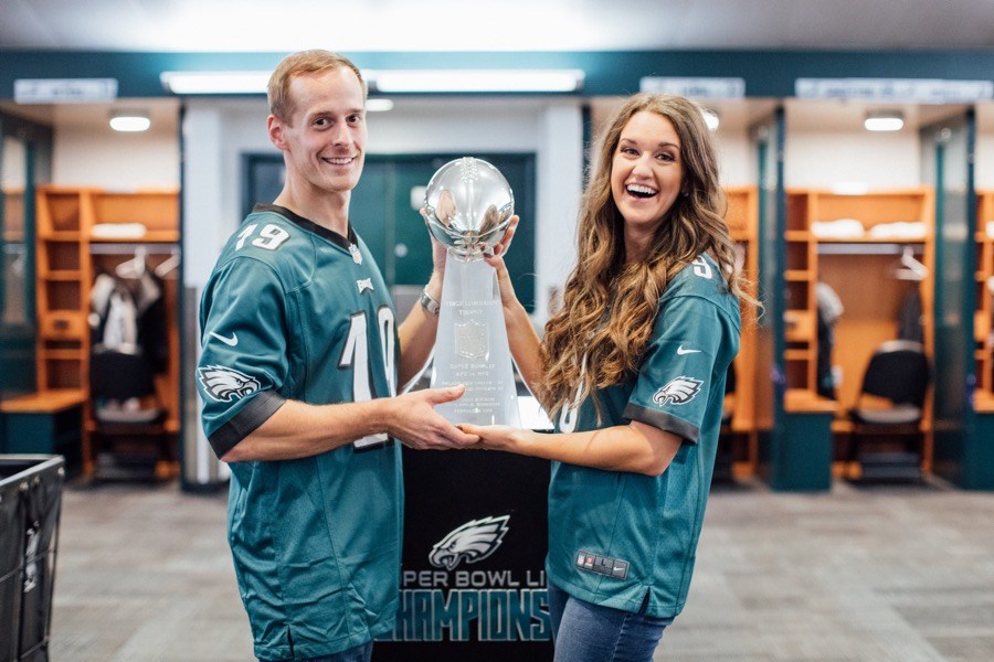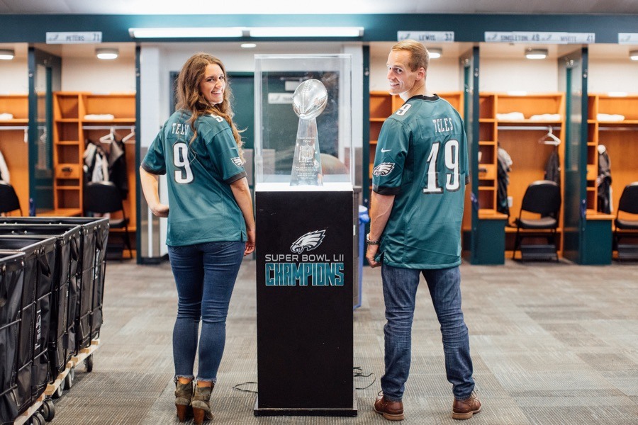 How we arranged to take photos on the field and in the locker room (in Meghan’s words): “There were no strings to pull. Anyone can do it! I looked up private photoshoots on the Eagles website and contacted Lynnette Camacho, the Director of Special Events, and she was so gracious and helped us plan. Now the fact that Justin wore a Super Bowl ring and we got to actually hold the Super Bowl trophy seems like we pulled some strings, but it was pure luck.