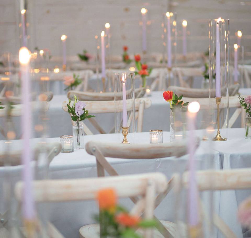 For the reception, long dining tables were clad in simple but pretty decor — lavender taper candles and petite bud vases.