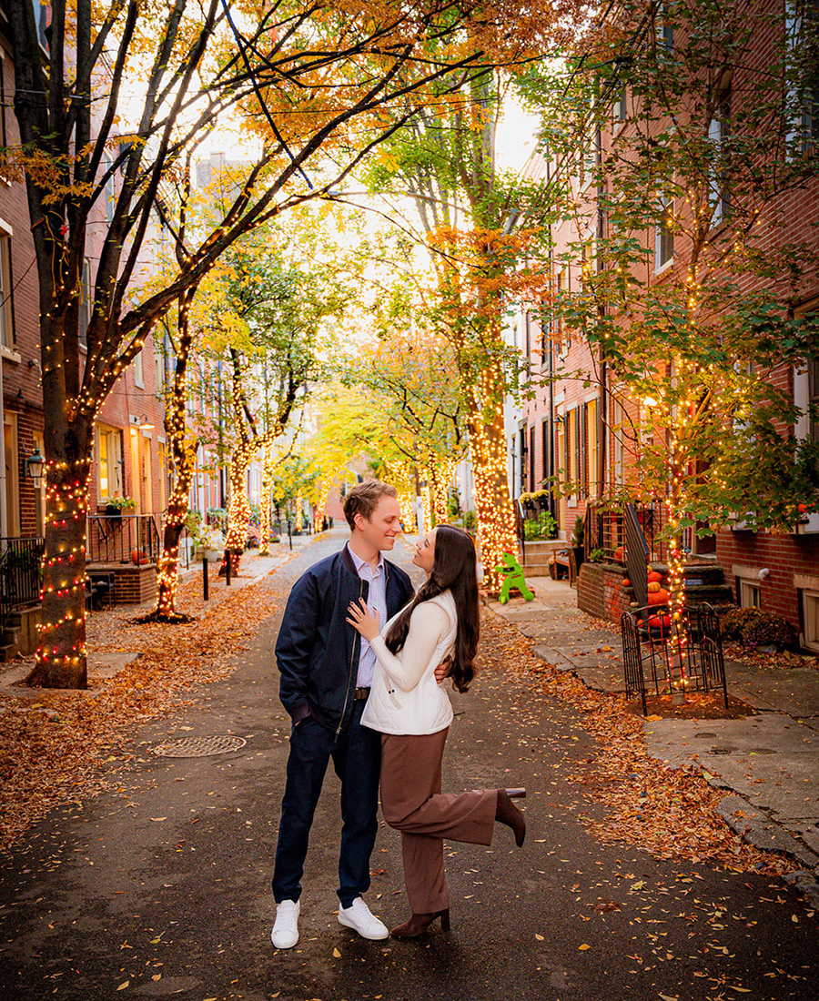 The proposal: Rob told Hannah they were heading to drinks at a co-worker’s house followed by a work dinner. It was a beautiful, early November evening, so the couple decided to walk to their destination. He turned onto Addison Street — a classic Philly proposal spot, beloved for its twinkly light-covered trees and historic architecture — and got down on one knee. (The work dinner was, of course, fictive. What followed instead was a romantic night to celebrate their engagement.)