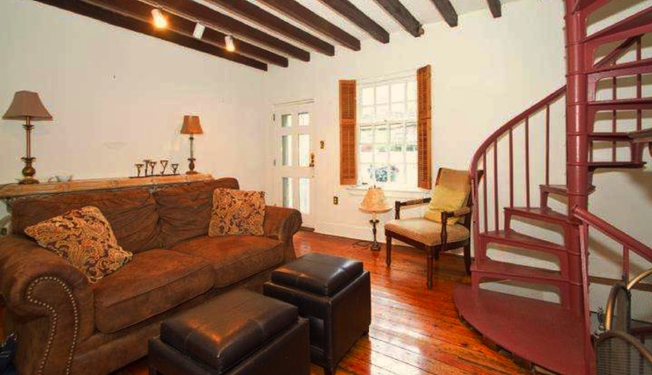 This little trinity, built in 1839, is situated on Panama St, just two blocks from Broad and Pine. Each level has original hardwood floors, save for the lower level kitchen, which has brick flooring and non-working brick fireplace.  In the living room, you’ll find wood beam ceilings and a working wood-burning fireplace.